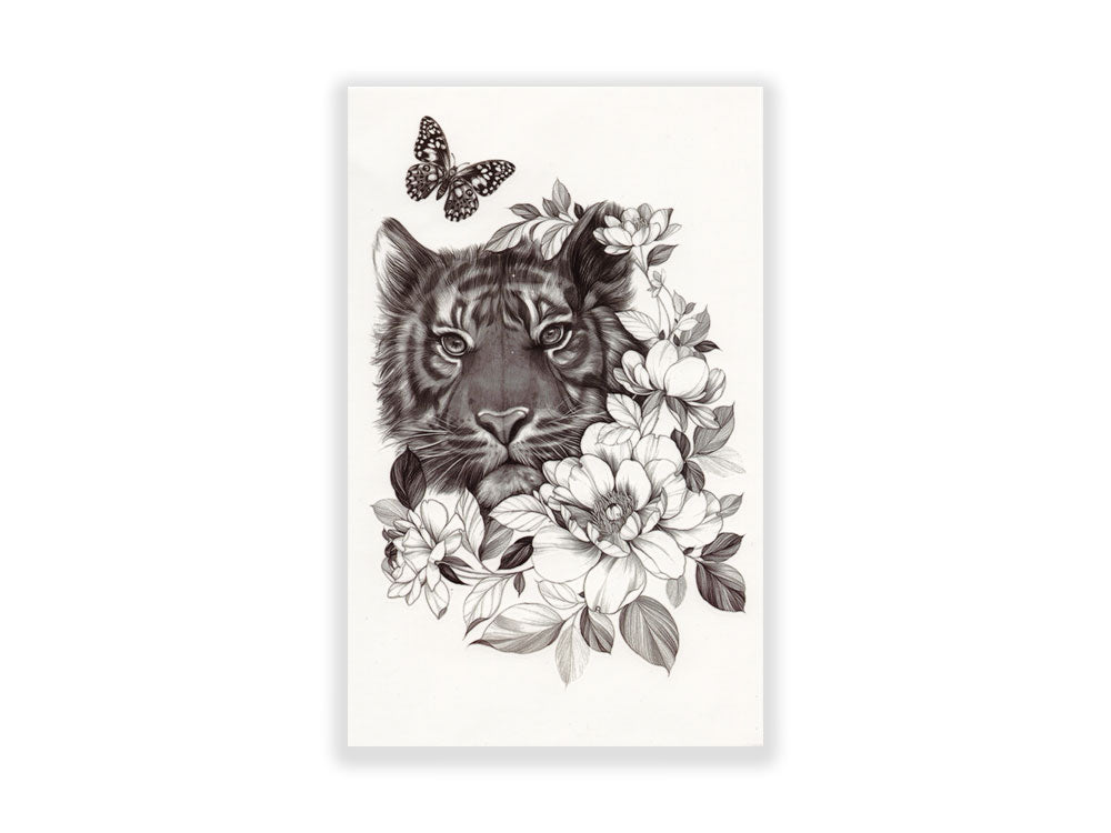 תעתוע קעקוע זמני בינוני שחור לבן לזרוע טיגריס מוקף פרחים ופרפרים – makeup.land