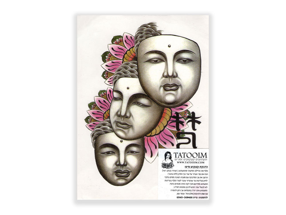 תעתוע קעקוע זמני גדול שחור לבן מזרח טריו מסכות טיבטיות על פרחי לוטוס