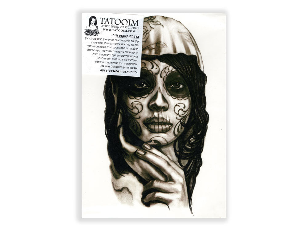 תעתוע קעקוע זמני גדול שחור לבן ציור אישה איפור גולגולת מקסיקנית ריאליסטי בעיפרון